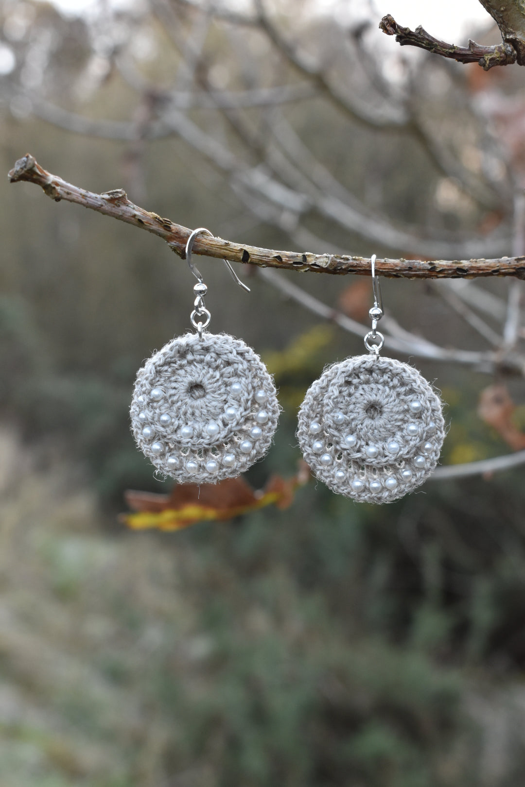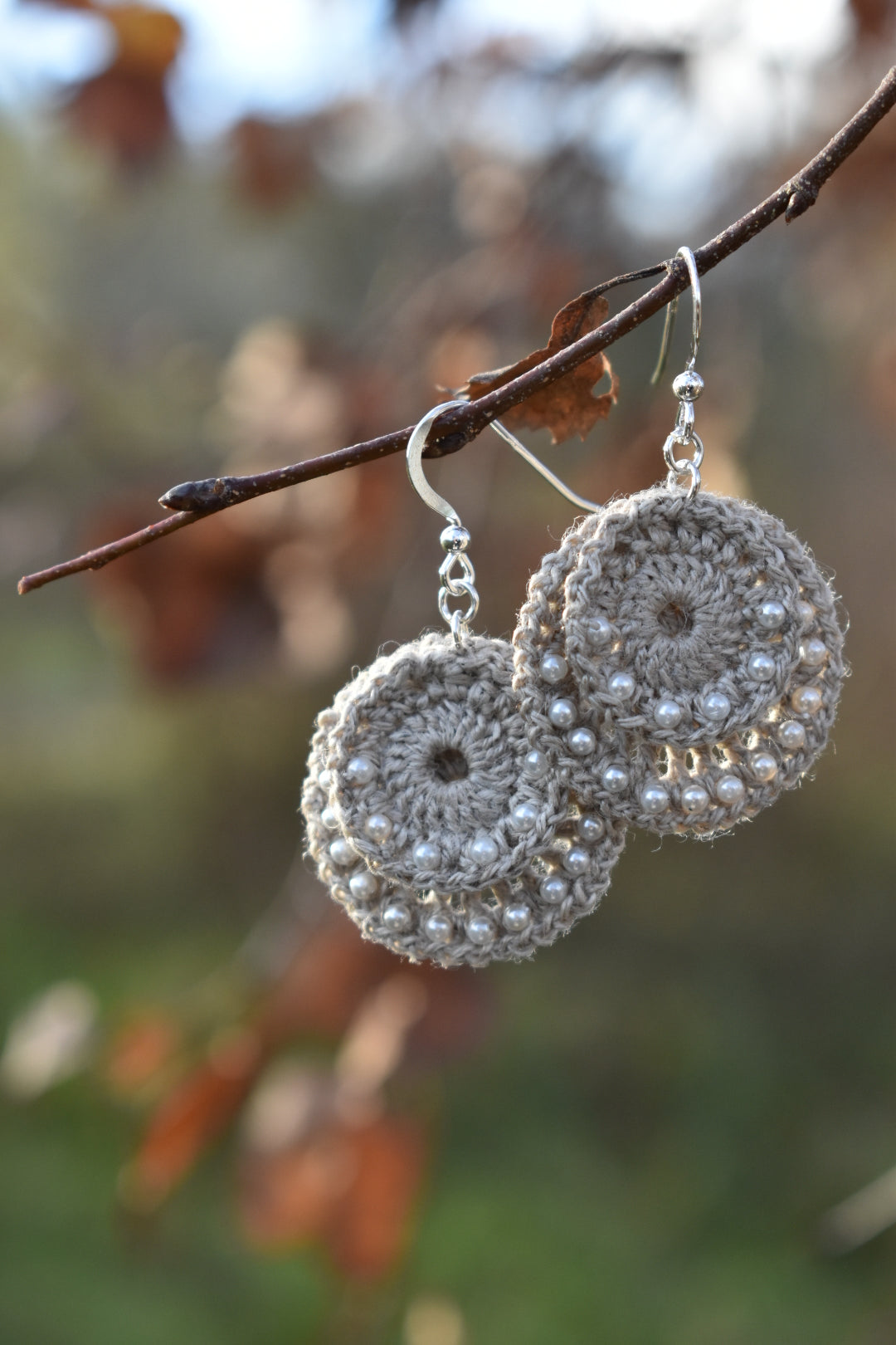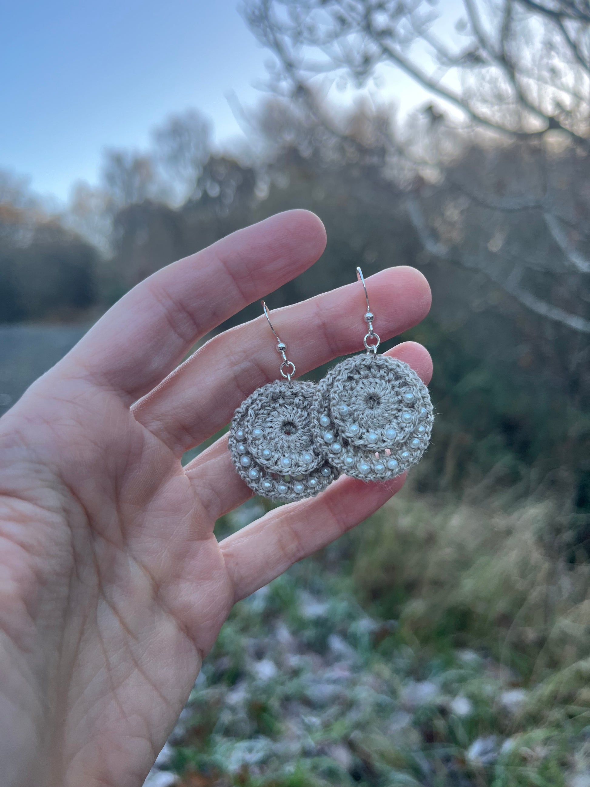 The Fairyfall Discs are hand-crocheted in natural linen, layered into gentle circles, and finished with tiny pearls woven through like morning dew.